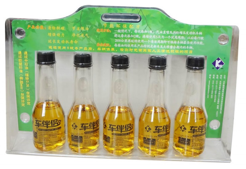 高科牌車伴侶汽油清凈劑(第四代燃油寶)是由兩種不同的高分子聚醚醇酰胺類混合物配以多種輔助劑復配而成,其中的重要成分是兩種不同的特種結構聚醚胺和聚醚醇酰胺,一種分子量約1000的合成聚醚胺具有非常強的清潔去垢作用,另一種分子量約2000的改性聚醚醇酰胺具有更高的養護保潔作用,同時具有減少汽油摩擦磨損的性能。這兩種特殊結構的聚醚胺都具有很好的抗氧化性和清凈分散性,對膠質化合物、微小顆粒具有極強的吸附及捕捉能力,可阻止其進一步的氧化和聚集,從而可大大減少汽油中沉渣的形成,與汽油的互溶性良好,且同時具有很好的防腐性能。該產品既具有一般PIBA(一般清凈劑常用的聚異胺)的清潔作用,同時分子量更大的胺熱穩定性好,對于發動機燃燒室前的油路系統具有更高的養護作用。與PIBA類的產品由于熱穩定性更強、燃燒不易于燃燒室形成二次積炭不同的是:這兩種特殊的胺類產品在隨著油氣混合物進入燃燒室,同時完成了對燃燒室積炭的軟化、分散、剝離、清除,后隨著油氣混合物一起燃燒,不會產生新的積炭等,終通過發動機排氣系統排出,因而該產品是目前對燃燒室清潔效果、安全的無灰添加劑。