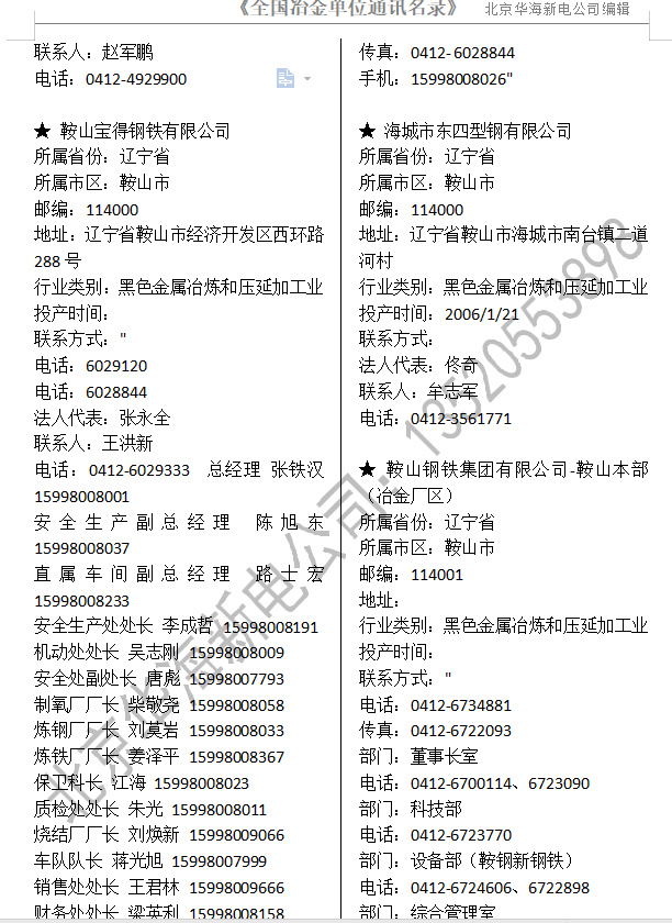 2020全國冶金行業(yè)(鋼廠鐵廠鋁廠有色金屬)通訊名錄,收錄了全國31個省市的金屬冶煉企業(yè)。主要包括黑色金屬冶煉及壓延加工業(yè)(鋼鐵廠)850家,銅冶煉企業(yè)350家,鋁冶煉企業(yè)410家,其他有色金屬冶煉300家,冶金礦山設(shè)計單位20多家。單位公司名錄信息包括:單位名稱、詳細(xì)地址、郵政編碼、企業(yè)法定代表人、聯(lián)系人、聯(lián)系電話、所屬行業(yè)、投產(chǎn)時間等。