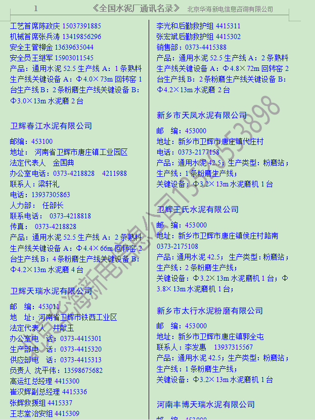 《全國水泥廠通訊名錄》由北京華海新電信息咨詢有限公司在2002年 開始發行,到今年已經走過了17個年頭,期間得到廣大新老客戶的支持幫助,在此一并致謝!《全國水泥廠通訊名錄》一直在更新,每年都會編輯進去新投產的水泥廠,停產的機組也會標注出來。水泥廠屬于產能過剩的行業,這幾年一直在關停并轉,企業名稱一直在變,本資料只提供企業現在的名稱。本書內容包括:全國31個省市地區的水泥企業3800多家。大、中、小型水泥生產企業(水泥廠、熟料廠、粉磨站)的地址、郵編、投產時間,產品,主機設備,重要科室負責人的姓名、聯系電話及部分。是企業聯系客戶的重要資料。