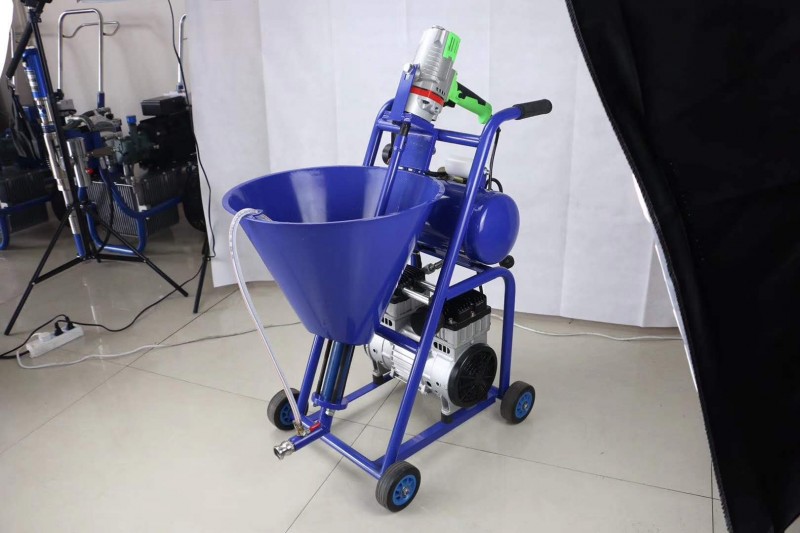 2.將攪拌均勻的材料放進(jìn)料斗,再將水泥管和噴涂槍或灌漿針頭與主機(jī)出漿口鎖緊