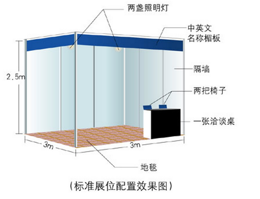 1、標準展臺:3㎡×3㎡=9㎡;普通標展:9800RMB/個;雙面開口標展:10800RMB/個;國際展商:USD3500元/個;標準展位包括地毯、三面圍板、公司名稱楣板、咨詢桌一張、椅子兩把、射燈兩盞、電源插座一個(特殊用電請事先說明,展館另行收費)。
