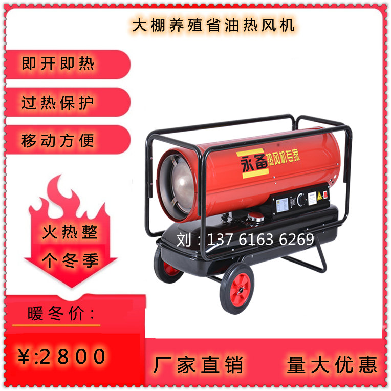 5、燃油熱風機有過熱保護裝置,超溫斷電,安全保護。風扇加熱,風力強勁體積小,高耐熱塑料把手,移動方便不消耗氧氣無煙、無味、無濕氣、低噪聲熱效應好傳送熱量快等。