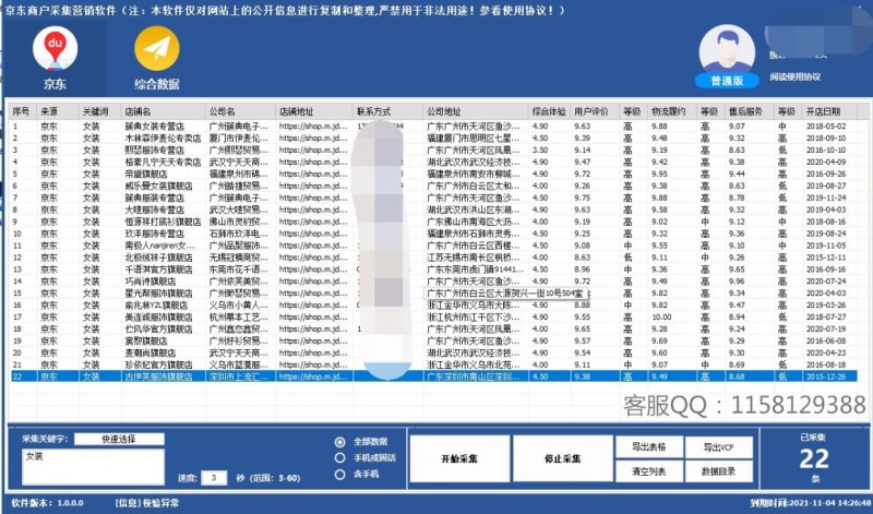 2、軟件可以采集到店鋪名稱、店鋪鏈接、聯系電話、各項評價數等。