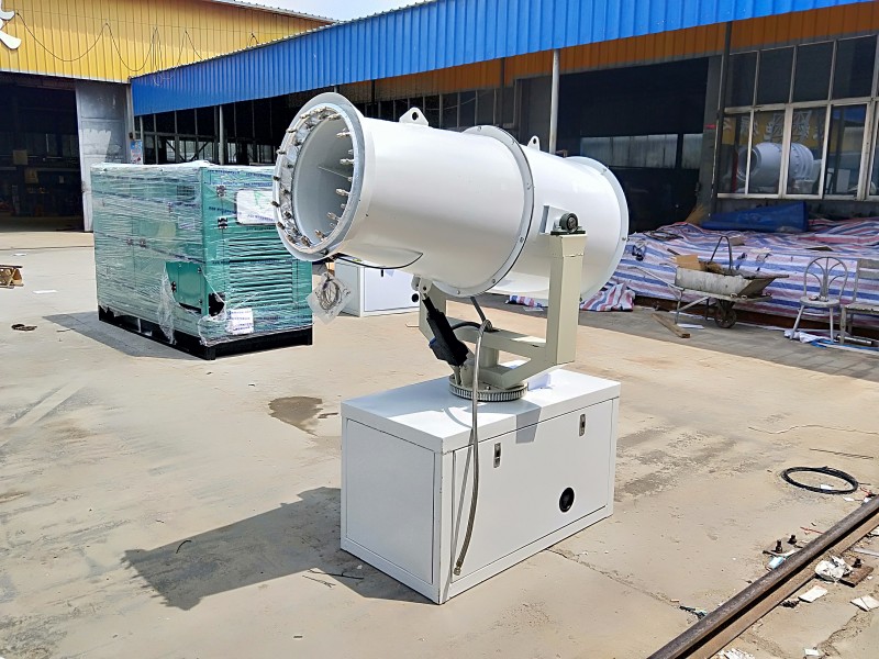 霧炮機是采用不銹鋼材質的高壓水泵和不銹鋼噴頭,通過高壓的作用把水輸送到噴頭噴射,形成細小的水霧,在風機的作用下把噴射出的水霧噴射到較遠的距離,將噴射出的水霧和懸浮氣流空氣中的粉塵吸附凝結成粉塵團,在通過自身的重力下達到快速降塵的目的,也同時解決了一些封閉式堆料場和煤礦開采作業時所產生的粉塵和局部揚塵的難題