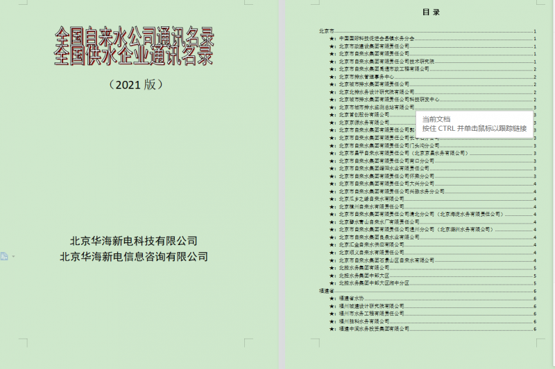 北京華海新電科技有限公司于2002年開(kāi)始編纂《全國(guó)自來(lái)水廠通訊名錄》,到今年已經(jīng)走過(guò)了19個(gè)年頭,《全國(guó)自來(lái)水廠名錄》頁(yè)碼由當(dāng)初的200頁(yè)擴(kuò)編到現(xiàn)在的520頁(yè)。期間得到了廣大客戶的幫助,在此一一致謝。