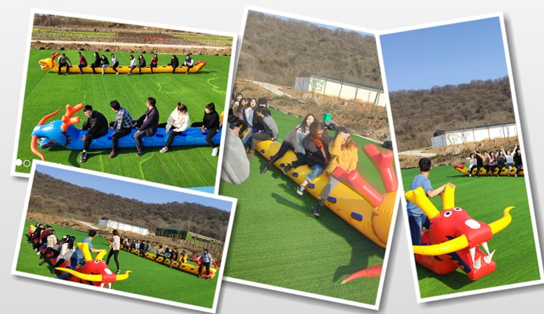 旱地龍舟那個項目很特別,大家都很樂意參加,每個人手提龍舟上的把手,腳踏地,準備向終點沖刺。由于我們的賽道很長,隊員們始終要步伐整齊,這就很考驗大家團隊之間的相互配合力度了,因此,我大力介紹你玩這個。