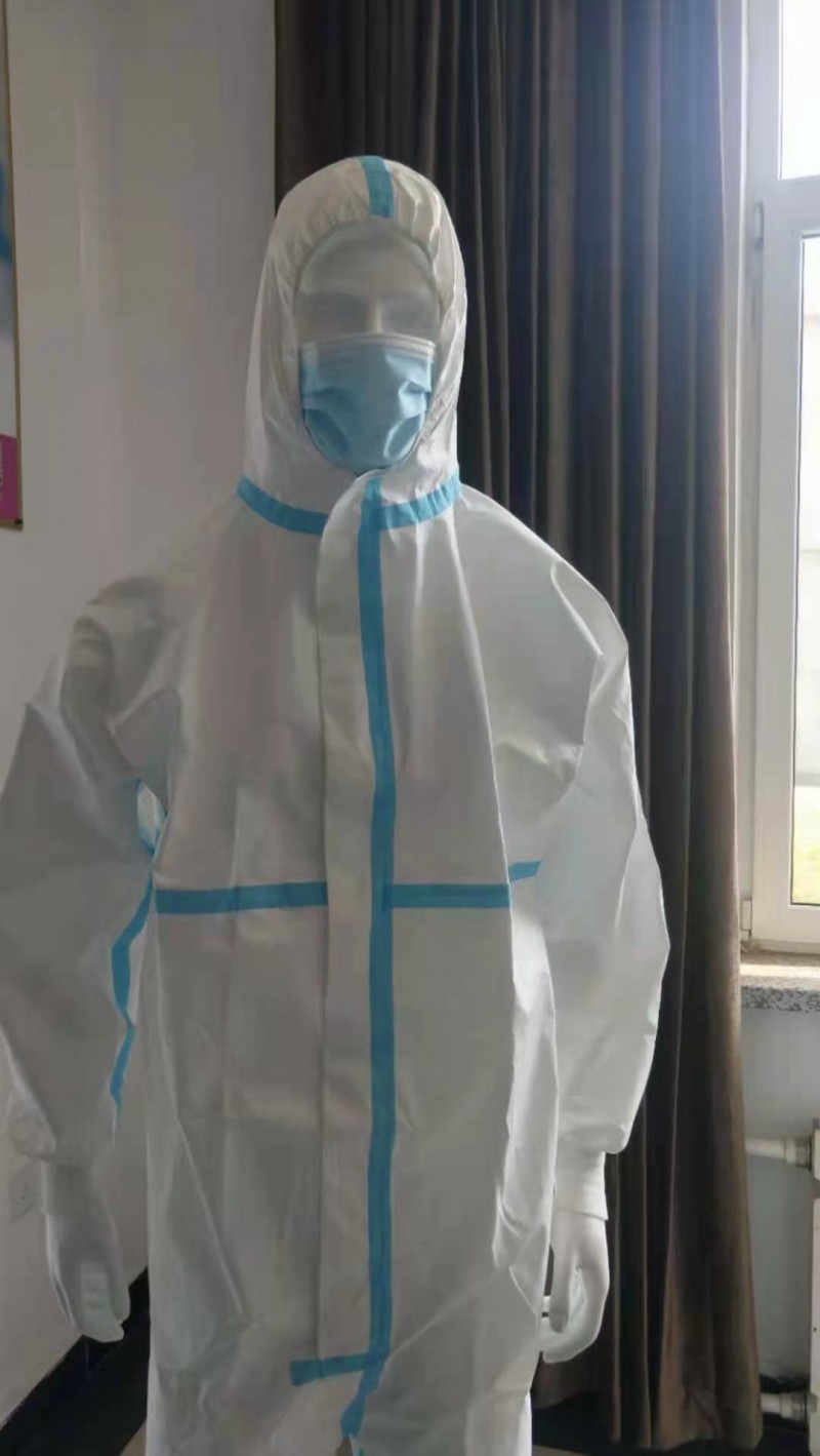 展開防護服,拉開拉鏈,從拉鏈開口處依次伸入雙腿,,再穿上衣,手從衣袖中伸出,帶好頭套,從胸前正面拉好拉鏈