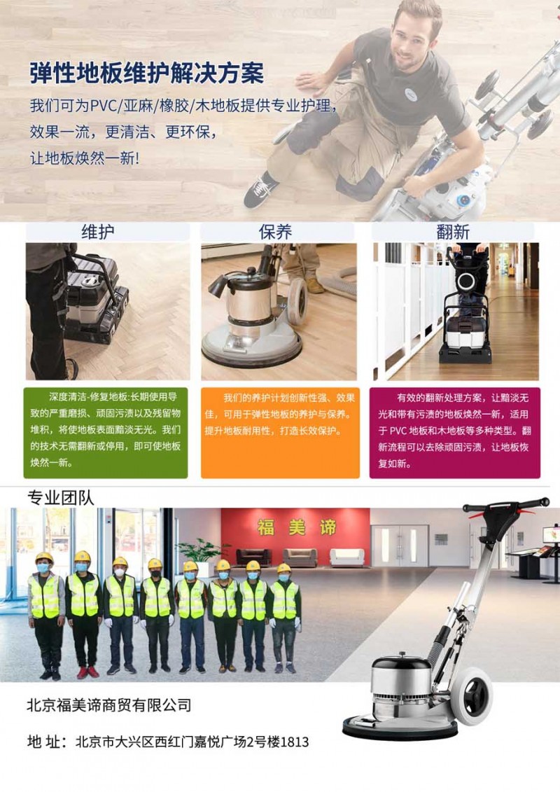 北京福美諦商貿有限公司為法國Gerflor潔弗樂地板華北代理商、中國彈性地板協會常務理事、北京市彈性地板協會監(jiān)事長單位、Gerflor潔弗樂彈性地板5S系統服務商,掌控多項地板施工核心技術、地板電腦雕刻技術和地板翻新技術,能讓您的地板保持歷久彌新。完善的售后服務體系可以使客戶無憂使用,提供更專業(yè)的解決方案。可提供地板維修、保養(yǎng)、打蠟、打磨、翻新、修復、拋光、修補、實木地板安裝上門等服務。