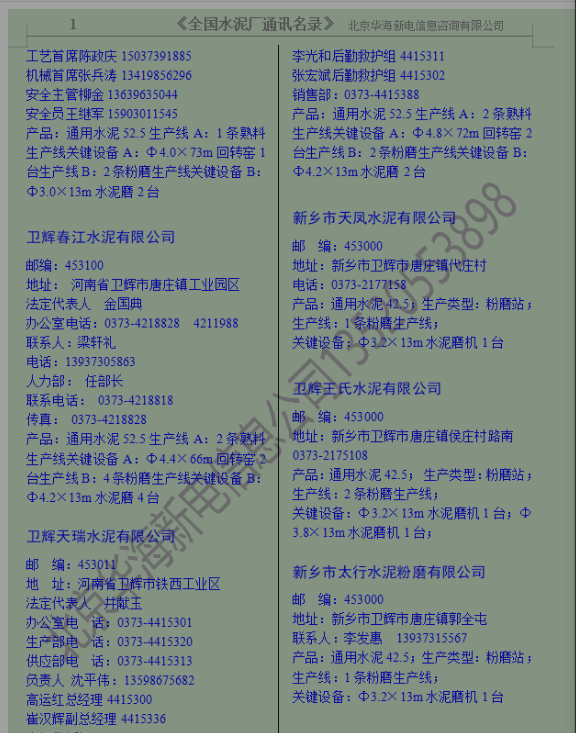 《全國水泥廠通訊名錄》由北京華海新電科技有限公司在2002年 開始發行,到今年已經走過了17個年頭,期間得到廣大新老客戶的支持幫助,在此一并致謝!《全國水泥廠通訊名錄》一直在更新,每年都會編輯進去新投產的水泥廠,停產的機組,產能出讓的廠家也會標注出來。水泥廠屬于產能過剩的行業,這幾年一直在兼并重組,產能轉讓,關停并轉,企業名稱一直在變,本資料只提供企業當前的名稱。本書內容包括:全國31個省市地區的水泥企業3800多家。大、中、小型水泥生產企業(水泥廠、熟料廠、粉磨站)的地址、郵編、投產時間,產品,主機設備,重要科室負責人的姓名、聯系電話及部分。是企業聯系客戶的重要資料。