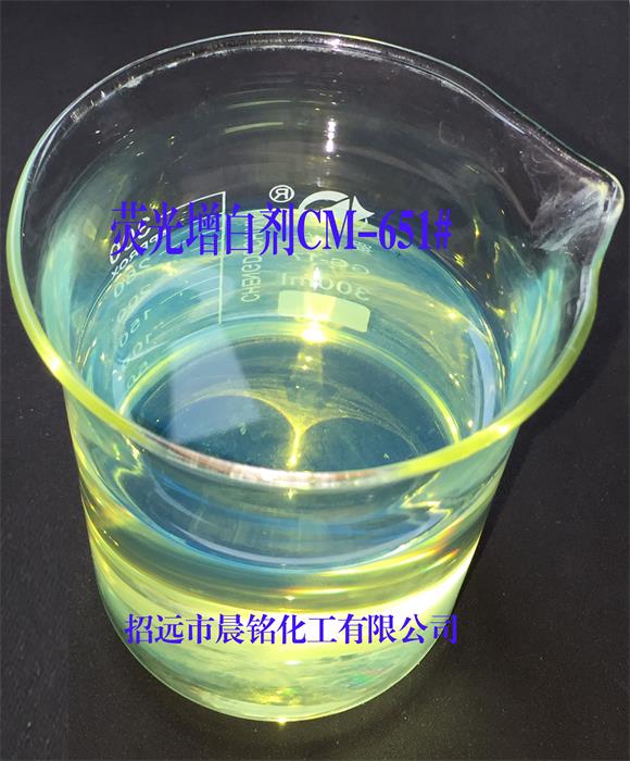 熒光增白劑CM-651,黃綠色液體,易溶于水,對酸穩定,耐過氧化氫漂白,對天然纖維具有高的直接性。能與水以任何比例溶解。在任何條件下可以任何倍量的水溶解均勻,并能在纖維中快速均勻分散,從而保證織物質量的穩定。織物不易黃變。因CM-651泛黃點比較高,所以可以持續疊加,可以持續累積白度,從而達到比較高的視覺白度。