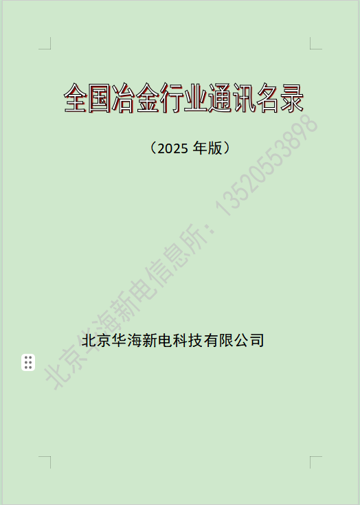 2025全國冶金行業(鋼廠鐵廠鋁廠有色金屬)通訊名錄,收錄了全國31個省市的金屬冶煉企業。主要包括黑色金屬冶煉及壓延加工業(鋼鐵廠)850家,銅冶煉企業350家,鋁冶煉企業410家,其他有色金屬冶煉300家,冶金礦山設計單位20多家。單位公司名錄信息包括:單位名稱、詳細地址、郵政編碼、企業法定代表人、聯系人、聯系電話、所屬行業、投產時間等。