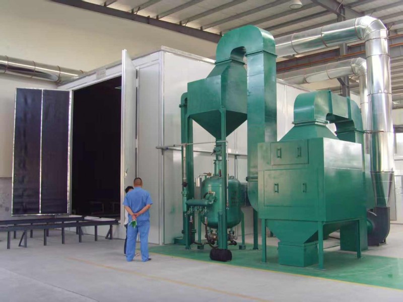 • 工作原理:操作員在房內使用噴槍對工件進行噴砂作業,剝離的雜質與部分磨料混合后落入底部格柵地板,通過螺旋輸送機或刮板輸送機將其輸送至斗式提升機,再運送到分離裝置,利用風選原理分離出可重復使用的磨料和粉塵,粉塵經濾筒除塵器過濾后達標排放。