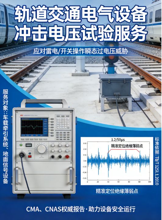 在軌道交通裝備的電氣安全體系中,沖擊電壓試驗是驗證設(shè)備絕緣耐受能力的核心環(huán)節(jié),也是保障列車運行可靠性的關(guān)鍵屏障。北京儀綜所試驗機構(gòu)作為國家認可的第三方檢測平臺,依據(jù)TB/T3251.1-2010、IEC62497-1:2010及GB/T32350.1-2015等行業(yè)標準,為軌道交通領(lǐng)域電工電子設(shè)備提供專業(yè)的沖擊電壓試驗服務(wù),并出具CMA、CNAS 認可報告。