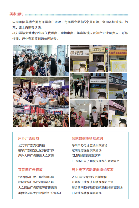 2、精準(zhǔn)買家邀約。美博會(huì)對(duì)于買家邀約重點(diǎn)投放,在全國(guó)各地舉辦推介會(huì),組織專業(yè)買家團(tuán)觀展。買家高效觀展,展商重點(diǎn)開(kāi)發(fā)客戶。