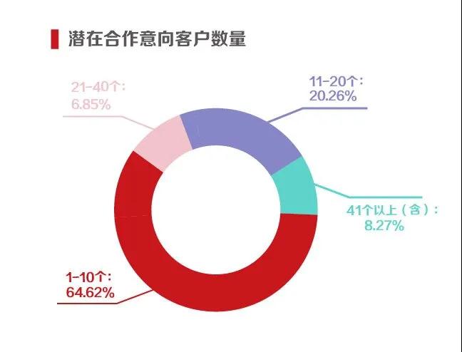 從調(diào)查可知,在展會(huì)期間獲得10個(gè)以內(nèi)潛在精準(zhǔn)合作的展商比例達(dá)64.62%,35.38%獲得11個(gè)以上潛在合作意向企業(yè),其中41個(gè)以上的比例比往屆有所增長,為8.27%。