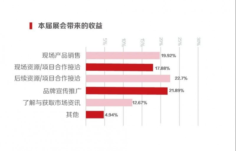 展會(huì)上給展商朋友們帶來了更多的現(xiàn)場(chǎng)資源對(duì)接,其中現(xiàn)場(chǎng)產(chǎn)品銷售為19.92%、現(xiàn)場(chǎng)資源項(xiàng)目接洽為17.88%;后續(xù)潛在的資源/項(xiàng)目合作接洽的效果較為明顯,占比達(dá)到22.7%;企業(yè)品牌宣傳推廣的比例也達(dá)到了21.89%。0.39%位居第二。