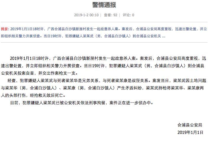 1月1日18時(shí)許,廣西北海合浦縣白沙鎮(zhèn)新屋村發(fā)生一起有意殺人案,導(dǎo)致一對(duì)父子經(jīng)急救無(wú)效死亡。據(jù)悉,犯罪嫌疑人與兩名死者為親兄弟、親叔侄關(guān)系。案發(fā)后,合浦縣公安局高度注重,迅速出警處置,并當(dāng)即組織相關(guān)警力開(kāi)展偵察。