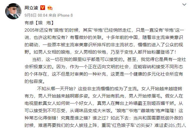 隨后,關(guān)于“娘炮”的話題還引發(fā)了網(wǎng)民的集體大討論。盡管有許多國人覺得男孩子就應(yīng)該剛烈,化著濃妝帶著美瞳的偶像藝人,只會(huì)教壞孩子,腐蝕咱們國家的風(fēng)氣。但也有犀利的看法指出,男孩子必需剛烈只是時(shí)代審美的問題,在多元化的今日各種審美都應(yīng)該獲得包容和尊重,誰也不能說“娘炮”風(fēng)的男孩子就不能做出貢獻(xiàn)了。