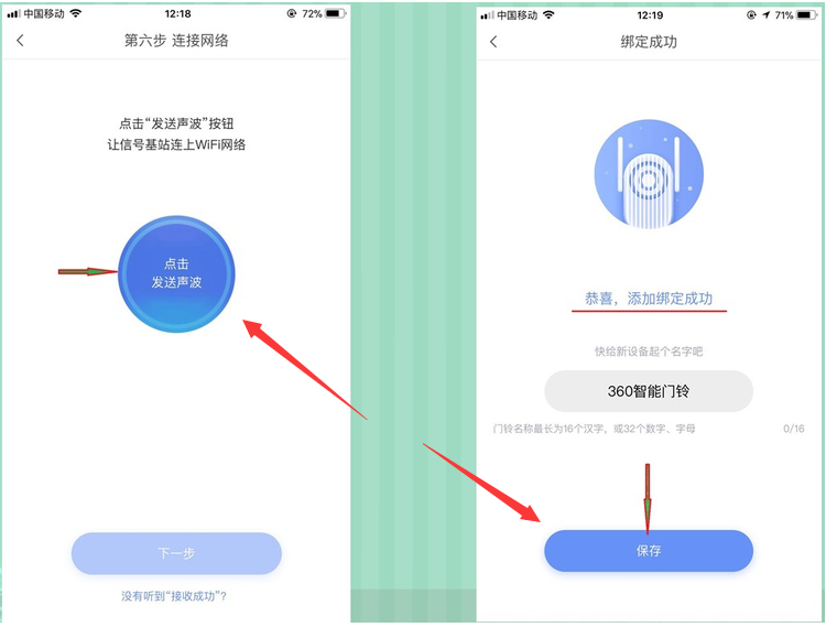 密碼輸入成功后,點擊“發送聲波”按鈕,基站接收到后,提示手機與基站鏈接成功!即手機與門鈴綁定成功!點保存。