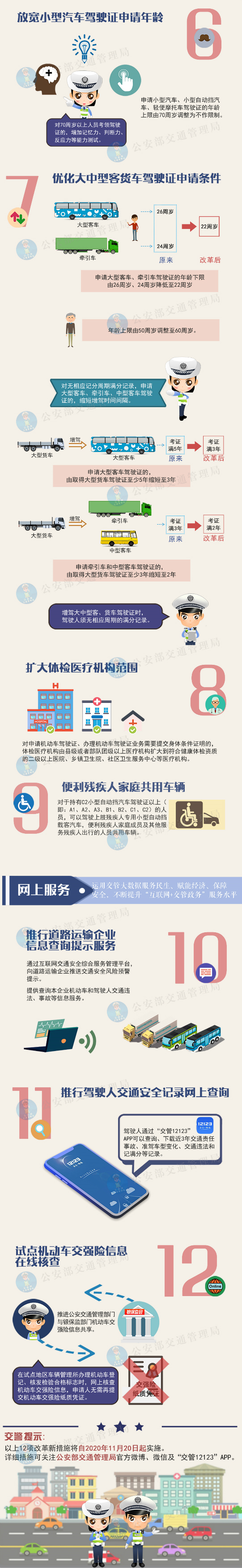 ——放寬小型汽車(chē)駕駛證申請(qǐng)年齡,取消申請(qǐng)小型汽車(chē)、小型自動(dòng)擋汽車(chē)、輕便摩托車(chē)駕駛證70周歲的年齡上限。對(duì)70周歲以上人員考領(lǐng)駕駛證的,增加記憶力、判斷力、反應(yīng)力等能力測(cè)試,保證身體條件符合安全駕駛要求。