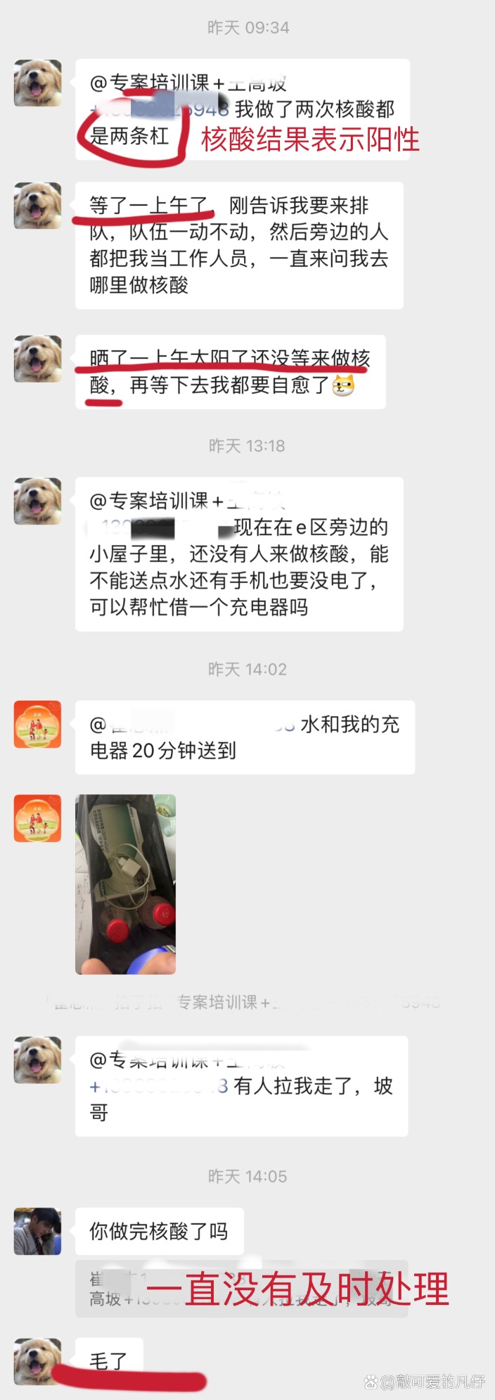 這么拖延和敷衍的處理方式,只會使事情變得更糟糕,果然,最不想看到的事情還是發生了,有一名菁干班成員抗原檢測兩次都為兩道杠。該成員曾經在群里反映過自己的住宿問題,無處可去,也表明自己身體不舒服,但是最后敷衍解決,在一個男寢打了地鋪。最無語的是他從上午都說自己陽性,直至下午都沒做上單采,到下午很晚的時候才被人拉走,拉走以后晚上也沒做上核酸。今天他們同宿舍的也有人抗原檢測出現了異常,不知道他們怎么處理的,我只知道他們宿舍有一個人今晚住在了廠區倉庫中。