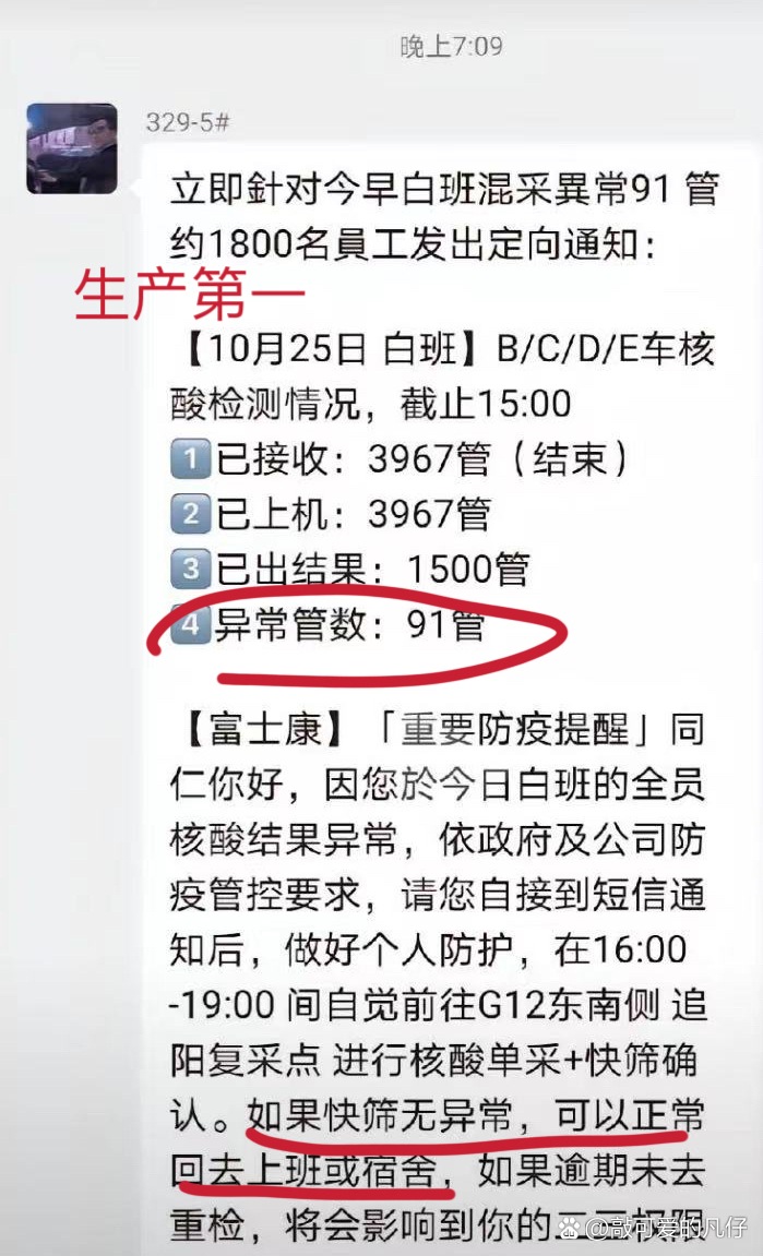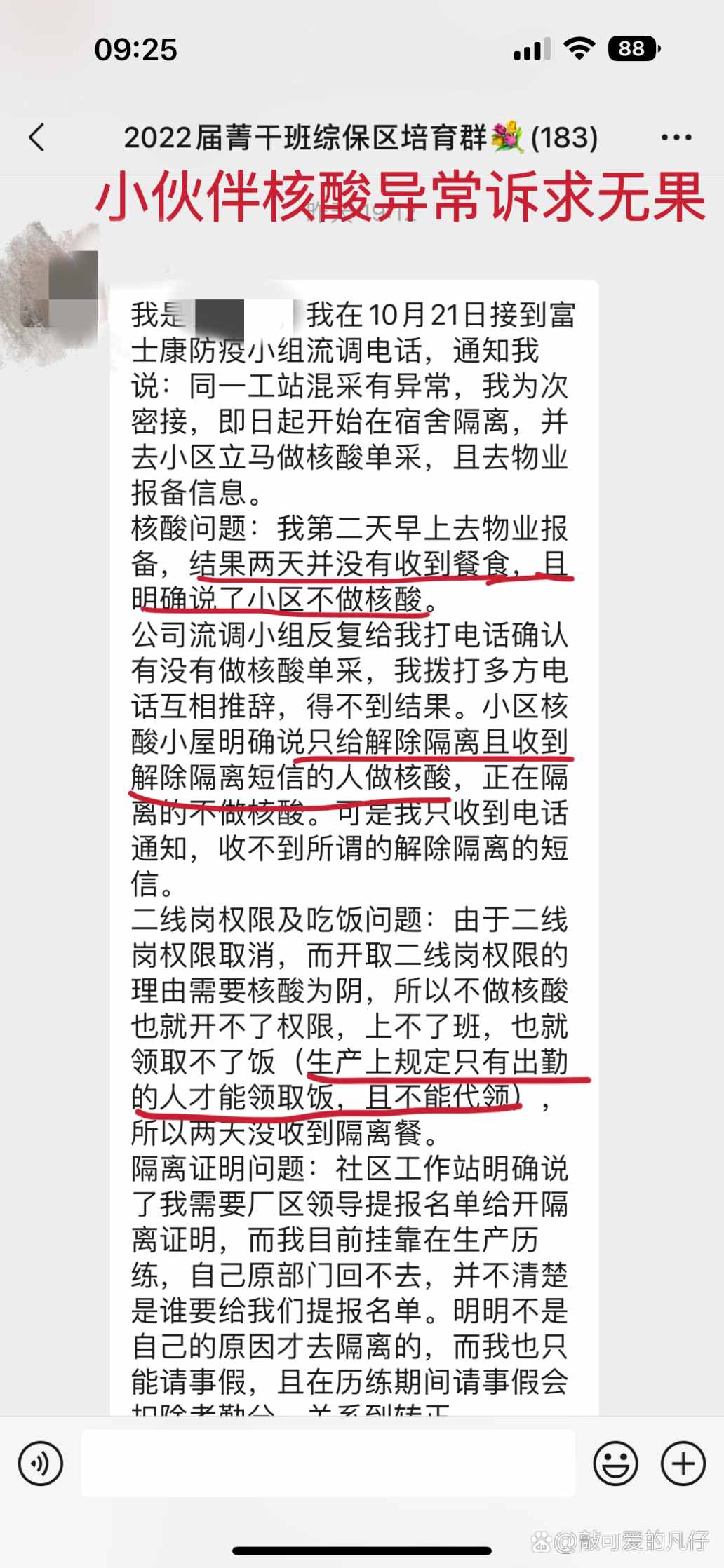這周疫情尤為嚴重,有小組待的車間出現了混管陽性,由于每個車間核酸點都是固定的,那么說明該車間內必有陽性。出現陽性病例之后,該小組很害怕,不敢進車間上班了,但是管我們的領導依然強烈要求要進入車間,繼續定崗定位。他們聽了領導的話,緊接著,他們的核酸也出現了異常。我們聽到這個消息,感覺都很慌張,第一次感覺疫情離我們這么這么近。可是出現異常的人員并沒有被拉走,而是一直待在宿舍,等了好幾天也沒有人上門單采。再然后,菁干班出現核酸異常的人員越來越多,混陽人員不止個例,但是這時候的處理方式直接是放任不管,可以正常上班,甚至有的密接者沒有去處,無家可歸,沒人管,向領導反映,也很久才進行安排,最終在男寢一個宿舍打了地鋪。