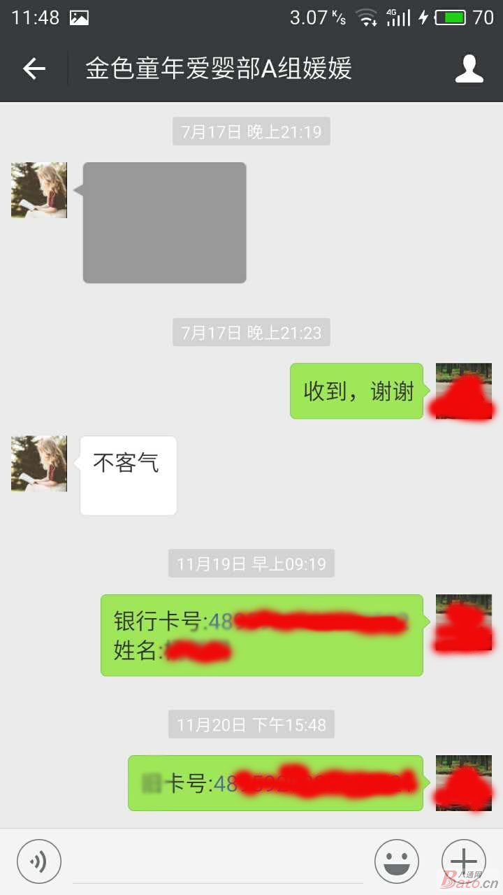 滿月照就拍了三個照型,效果一般,感覺孩子很小也沒在意。接下來,百天照選了6件衣服,拍的時候把寶寶折騰壞了,受大罪了。當天拍完后,讓付剩余款,我老婆說看完效果后考慮是否再付。結果金色童年不答應,說只有全付款后,才向下走流程。不想與他們爭吵就說服老婆付了剩余款項。等了一星期11月6號來選照片的時候,看到拍了120多張,感覺拍的效果很一般,并且只能選30張底片。如果多要一張放到光盤里要加錢25元一張(真心黑,就是拷過來),服務員態度也不好。與老婆一商量一下剩余不拍了,要他們退款。他們也很痛快地答應退款,但要按原價扣掉這次拍的百天照1699元(真太媽的卑鄙),也忍了,退款時,讓我留了支付寶,說15天內退,退時會提前給打電話。