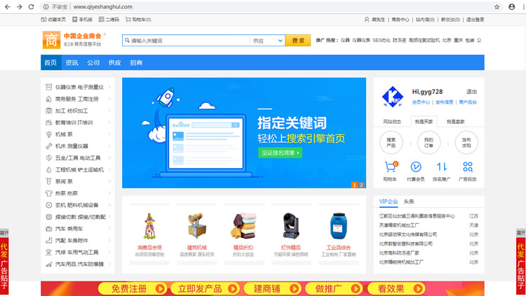 匯總收集一些免費(fèi)的B2B網(wǎng)站,比如:阿里巴巴、企商匯(m.linfenxz.cn)、世界工廠、環(huán)球資源等等,然后在這些B2B網(wǎng)站注冊(cè)會(huì)員賬號(hào)即可,有些B2B網(wǎng)站注冊(cè)需要提交公司營業(yè)執(zhí)照,那么我們可以找朋友公司營業(yè)執(zhí)照或網(wǎng)上找個(gè)營業(yè)執(zhí)照PS一下即可。
