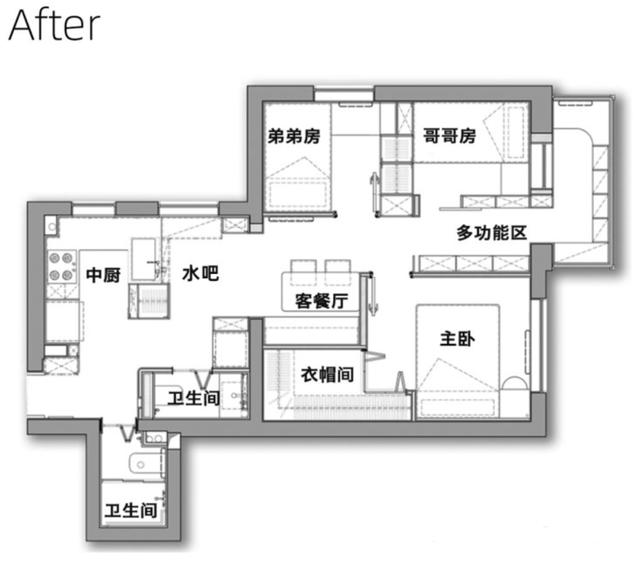 結(jié)合屋主的家庭成員結(jié)構(gòu),整體做了三室兩衛(wèi)一廳一廚布局,具體調(diào)整如下。