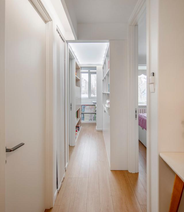 由于兩間臥室的結(jié)構(gòu)進(jìn)行了重組,中間也自然形成了一個(gè)通往陽臺(tái)的過道。雖說看起來有些狹長(zhǎng),但面積并沒有浪費(fèi),并且還起到了為室內(nèi)引光的作用。