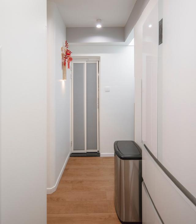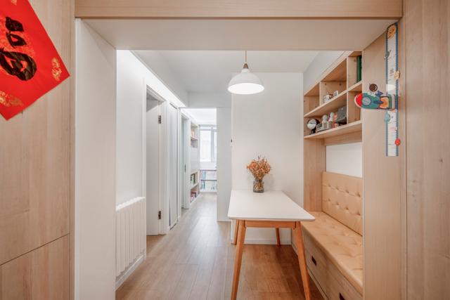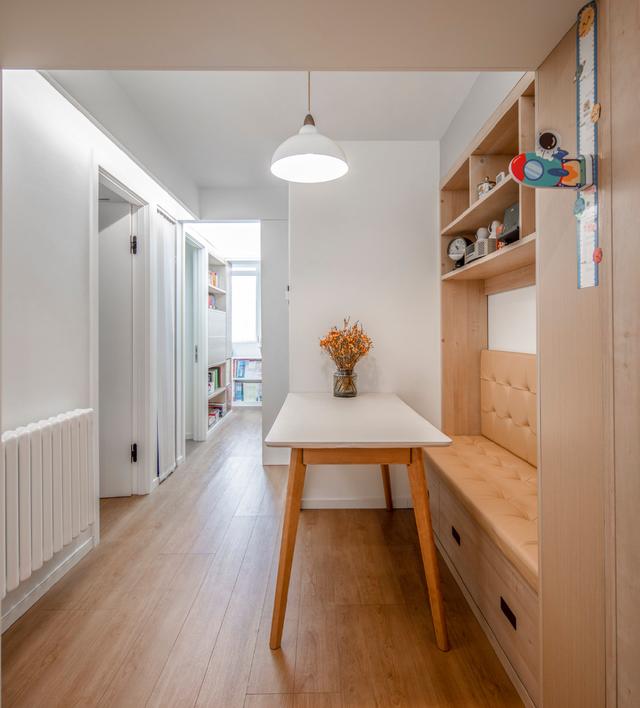 原戶型進(jìn)門并沒有一塊合理的收納區(qū),所以在改造時(shí),就利用廚房的墻體隔斷,改造出了一組日常鞋柜,以解決基本的收納需求。