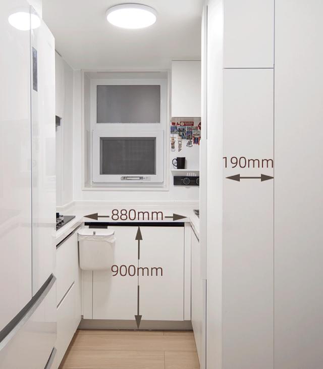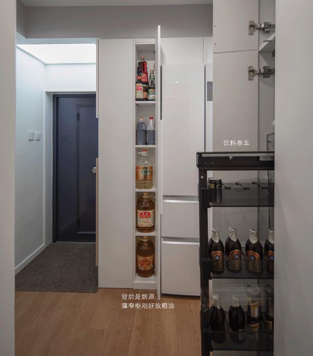 除此之外,利用煙道與鞋柜之間的內(nèi)陷空間,設(shè)計(jì)一個(gè)24cm的薄柜,剛好可以用來存放糧油,并隱藏了煙道,讓空間更具整體感。