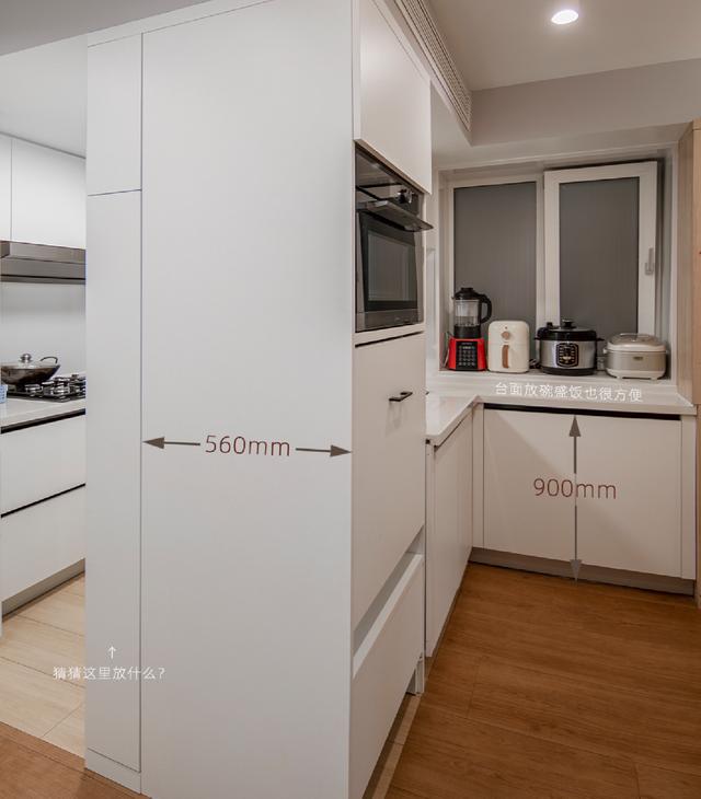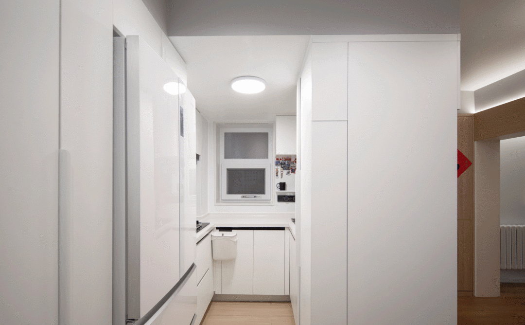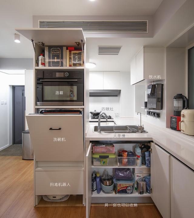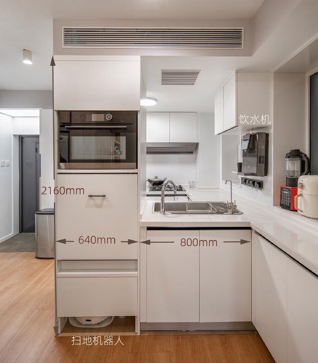 兩塊空間之間增加高柜隔斷,滿足烤箱、洗碗機(jī)、掃地機(jī)器人收納。而像這種“精打細(xì)算”式的結(jié)構(gòu)規(guī)劃,也最大化提升了空間收納率。