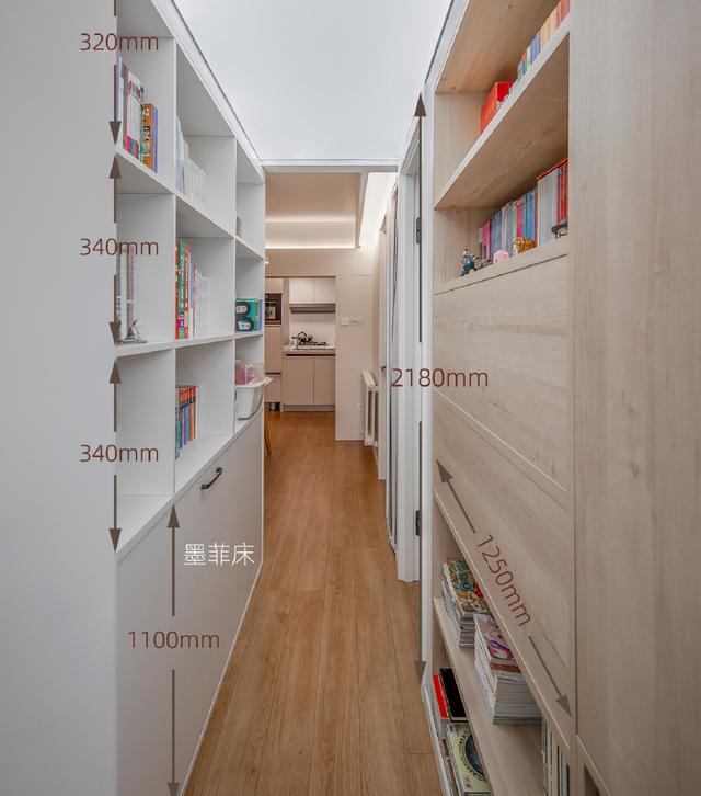 不僅如此,左側(cè)柜體底部?jī)?nèi)嵌墨菲床,展開后還能當(dāng)作一張單人床使用。這樣一來,即便長(zhǎng)輩偶爾過來,也能滿足全家人的居住需求。