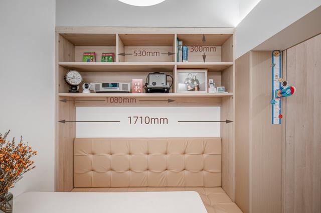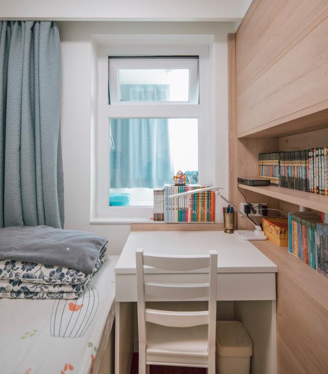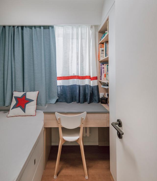 弟弟房間的布局,基本上與哥哥房間一樣。同時(shí),兩個(gè)房間之間用柜體+窗戶隔斷,也保留下了一定的通風(fēng)采光環(huán)境。