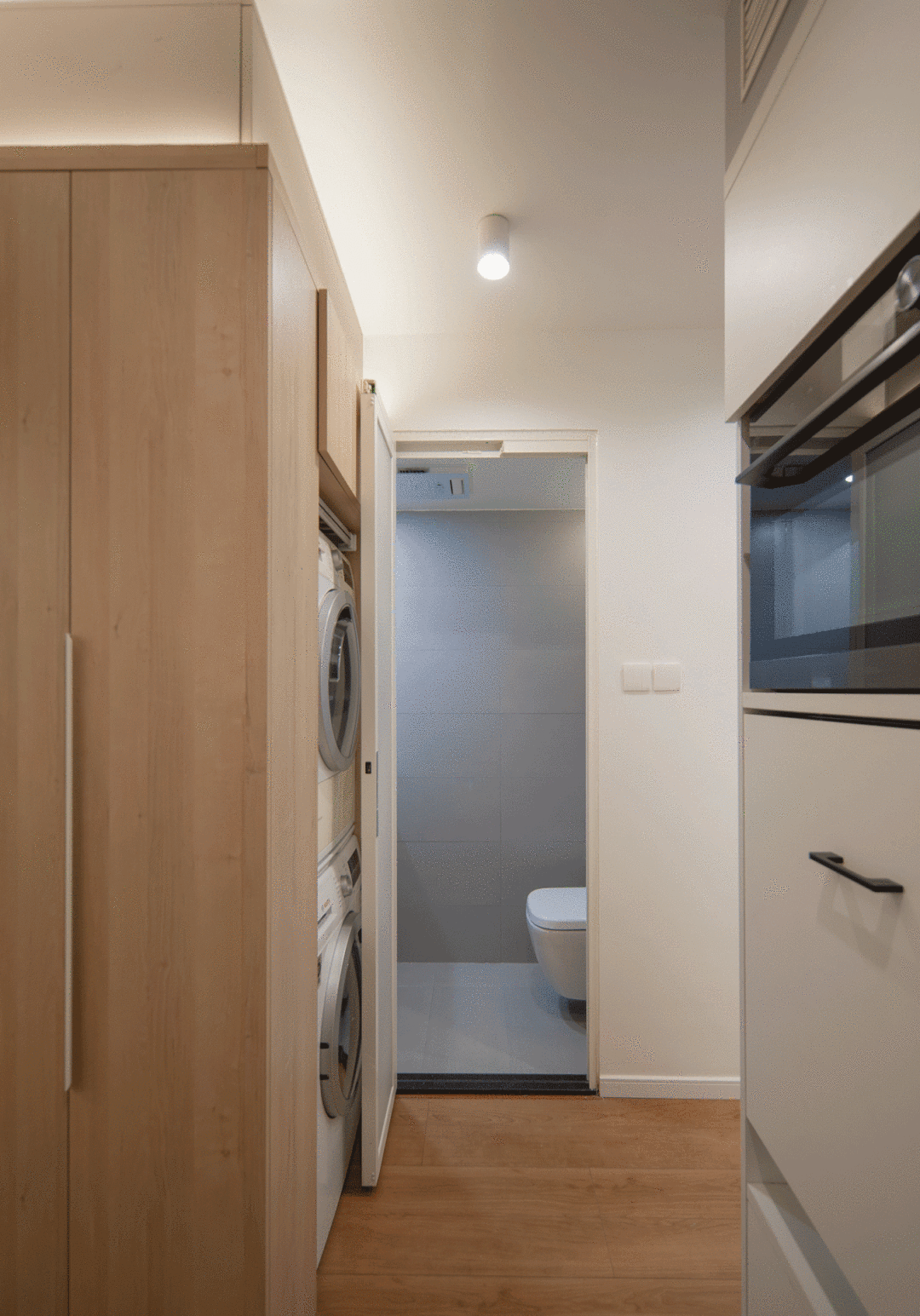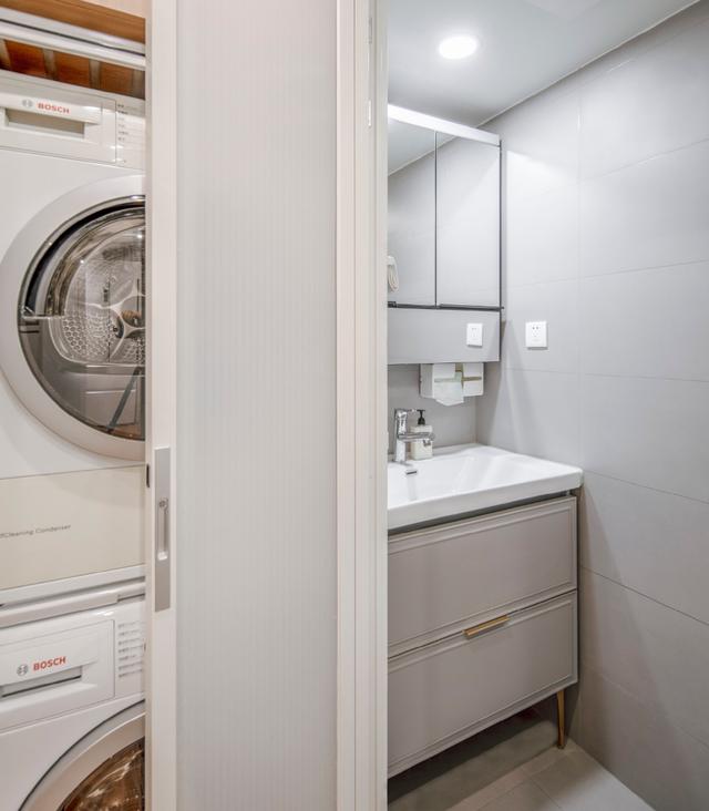 雖說內(nèi)部?jī)H增加了馬桶和洗漱,但也有效優(yōu)化了生活效率。除此之外,門外一體的家政柜設(shè)計(jì),也讓洗烘設(shè)備和清潔工具得到了有序收納。