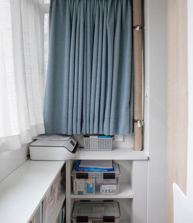 陽臺(tái)以半圍合式的結(jié)構(gòu),設(shè)計(jì)了一組低矮的開架,延續(xù)了過道的儲(chǔ)物能力,并且還兼具了辦公區(qū)的功能性。