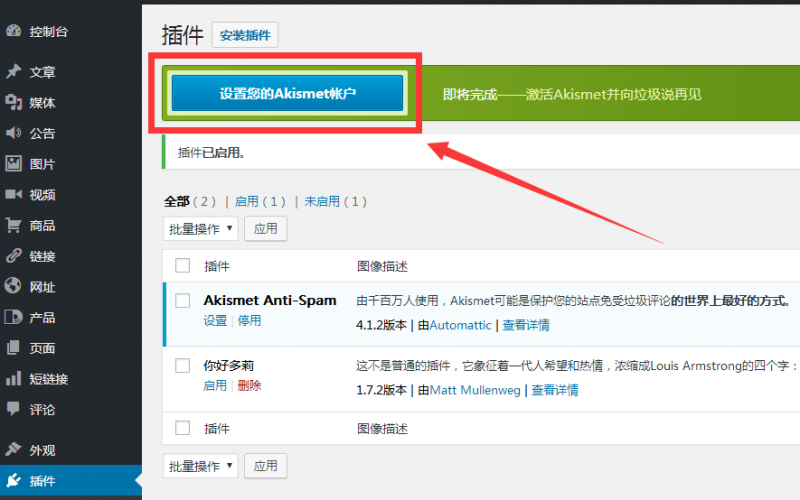 登錄你的Wordpress網(wǎng)站后臺(tái),點(diǎn)擊【插件】--啟用“Akismet”--【激活您的Akismet賬號(hào)】或者點(diǎn)擊“Akismet”插件的“設(shè)置”按鈕;