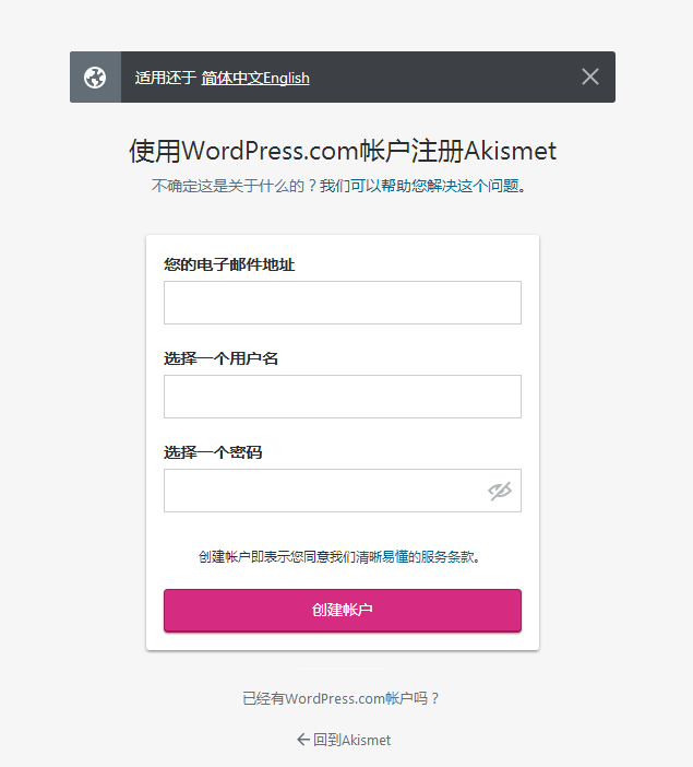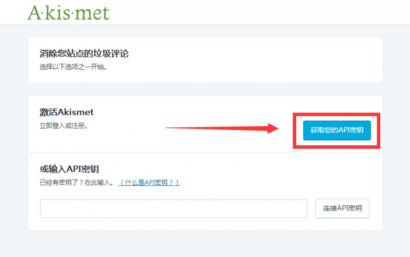 點(diǎn)擊--【獲取您的API密碼】,創(chuàng)建“Akismet”帳號(hào);