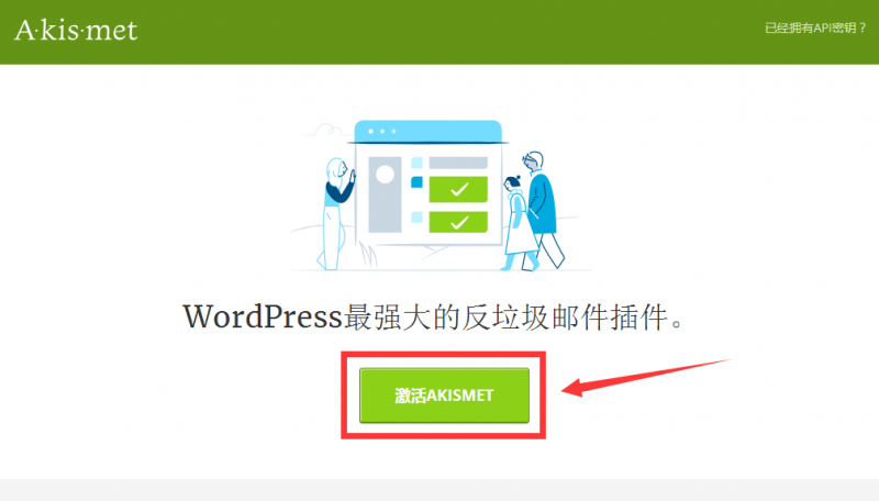 進(jìn)入AKismet激活頁面(我用瀏覽器翻譯插件把英文頁面翻譯成中文頁面),點(diǎn)擊:激活A(yù)KISMET