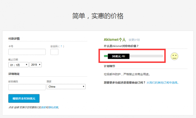 這時(shí)你會(huì)看到左側(cè)是一些支付選項(xiàng),右側(cè)是需要支付的錢數(shù),不用管它,鼠標(biāo)拖動(dòng)右側(cè)的按鈕移到最左邊價(jià)格就是零美元了。First name下面寫的姓氏,Last name下面寫你名字,然后點(diǎn)擊"CONTINOE"按鈕就可以生成一個(gè)免費(fèi)的API密鑰了。