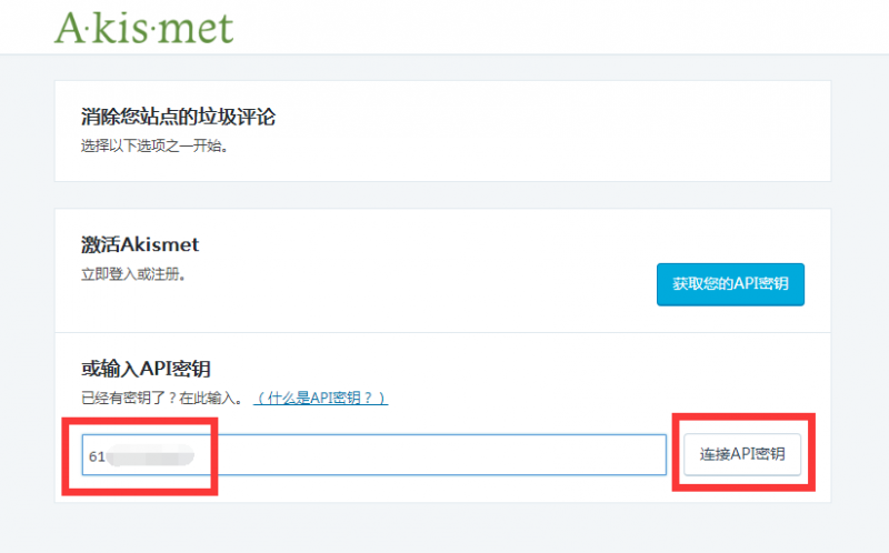 回到網(wǎng)站后臺(tái)管理,點(diǎn)擊【設(shè)置】--”Akismet“輸入我們剛才獲得的API密鑰就可以啟動(dòng)了。