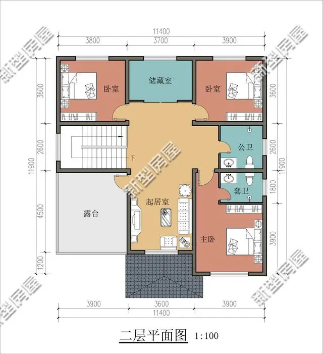 第4套:雙入戶門+觀景露臺+多臥室,9×14米新中式戶型,主體預算30萬