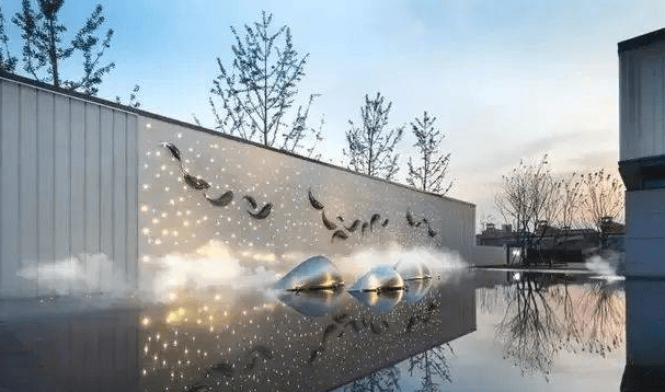 利用特別的噴霧噴頭,噴出霧狀般水流,能以少量水噴灑到大范圍空間內造成氣霧濛濛的環境,當有燈光或陽光照射,可呈現彩虹當空舞的景象,對水的冷卻、充氧加強及對空氣的加濕、除塵作用特別明顯。與其它噴水、彩燈配合造型,更能烘托出環境氣氛。作為一種設計之美,可以用來表示安靜的情。