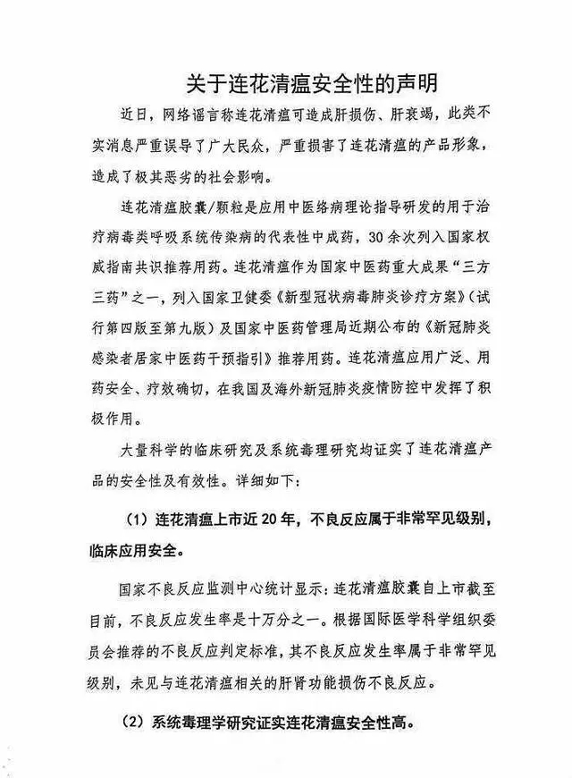 相關媒體及個人捏造傳播“連花清瘟可造成肝損傷、肝衰竭”虛假事實,對我司及產品商譽的失實言論和惡意詆毀,嚴重侵犯了我司權益,我司保留通過法律手段維護自身合法權益之權利。