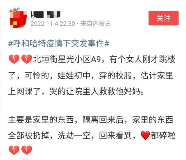這起悲劇,除了讓呼和浩特小區(qū)焊死的單元門一夜解封,還有一個不那么引人注意,卻很可能是直接誘發(fā)跳樓母親焦慮障礙的“強(qiáng)盜式”入戶消殺。按照網(wǎng)絡(luò)上流傳卻至今未見辟謠的說法,這對母女結(jié)束隔離轉(zhuǎn)陰回家后,發(fā)現(xiàn)家中形同洗劫,消殺隊伍把一些物品扔了,這名母親萬念俱灰才跳樓的。
