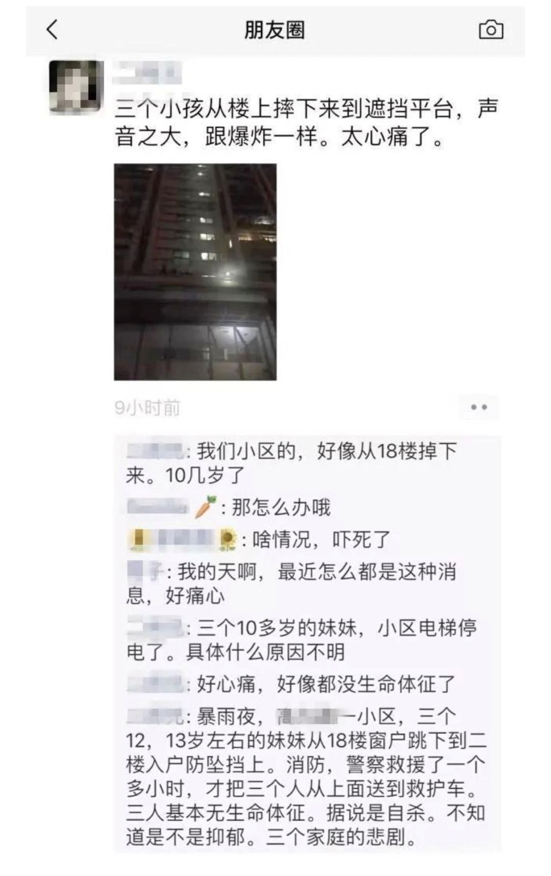 2019年9月8日,一個陰雨朦朧的夜晚,重慶石橋鋪半山7號小區(qū)高層住宅區(qū)19號樓,3名十二三歲的女孩從18樓一起跳下,當場身亡。消防員、警察、120趕到后,因為消防道堵塞,云梯沒能送到,經(jīng)過一個小時的救援,才把三人送上救護車,遺憾的是,當時三人已無生命體征。