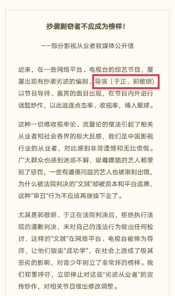 這111位名單中包括瓊瑤、董潤年、趙冬苓、束煥、汪海林、王立扶、馮元良、高群書、何秀瓊、劉沛、王小平等著名影視從業者。前幾日知名編劇汪海林就曾發博:于正和郭敬明是被中國編劇行業開除了的,在編劇這個行業里“社會性死亡”了,“任何正規的編劇活動里都不會有他們出現……”