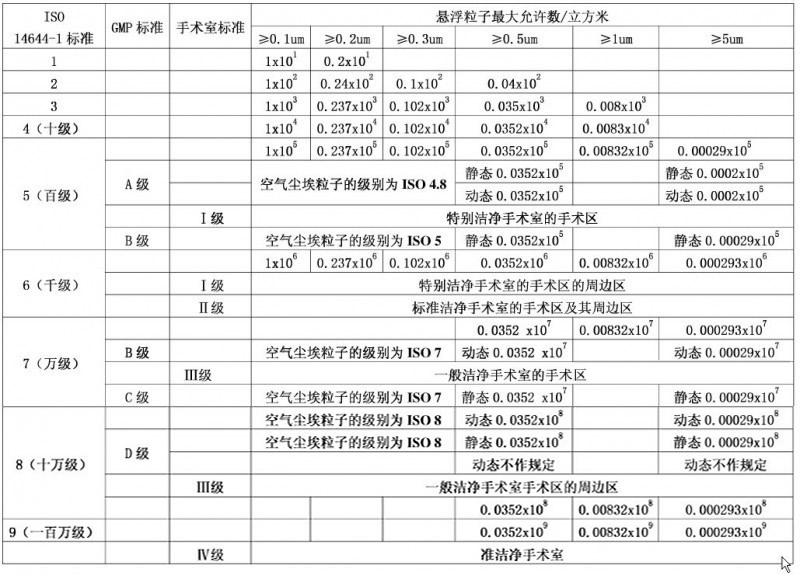 潔凈室等級(jí)標(biāo)準(zhǔn)ISO和中國(guó)2010版GMP對(duì)比表: