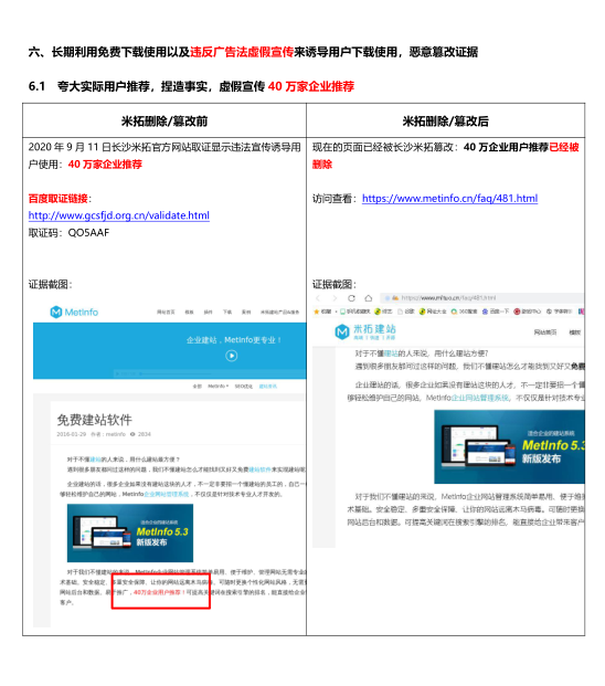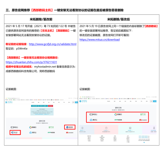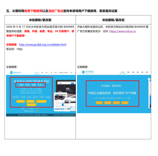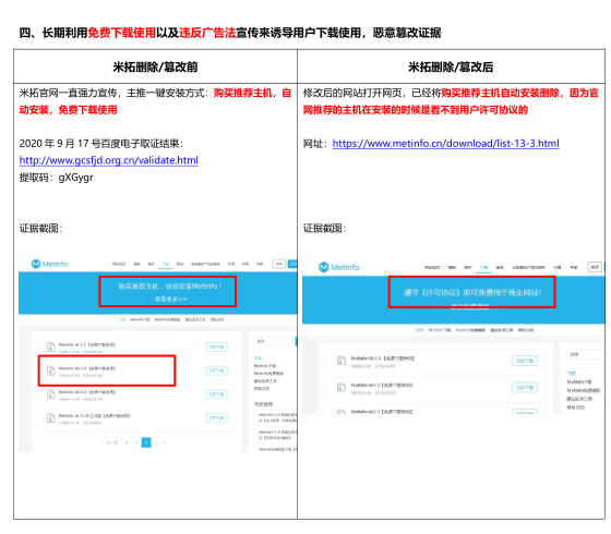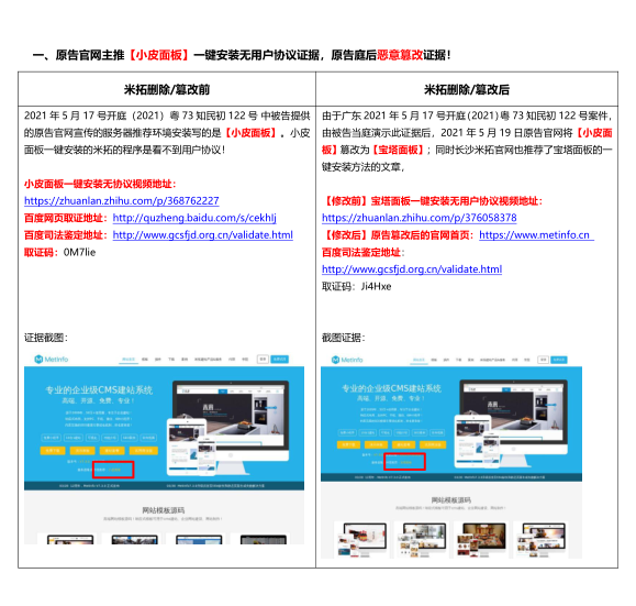 長沙米拓公司一直不斷的惡意篡改與銷毀證據,長沙米拓官方網站推薦的:小皮面板、寶塔面板、無憂主機、西部數碼等在用戶使用過程中均可以一鍵安裝且看不到長沙米拓用戶許可協議!此四個官方推薦的面板與平臺,均有特別大面積的二級,三級代理商,涉及面積用戶非常龐大,所有證據均能顯示長沙米拓經過長年的違法宣傳、釣魚發布無法看到用戶安裝協議的安裝版本,在用戶收集證據后提交法庭,均被長沙米拓惡意刪除!造成大量企業受害者舉證困難,現整理米拓一部分惡意修改以及刪除證據前后對比,看清長沙米拓公司丑陋的嘴臉!